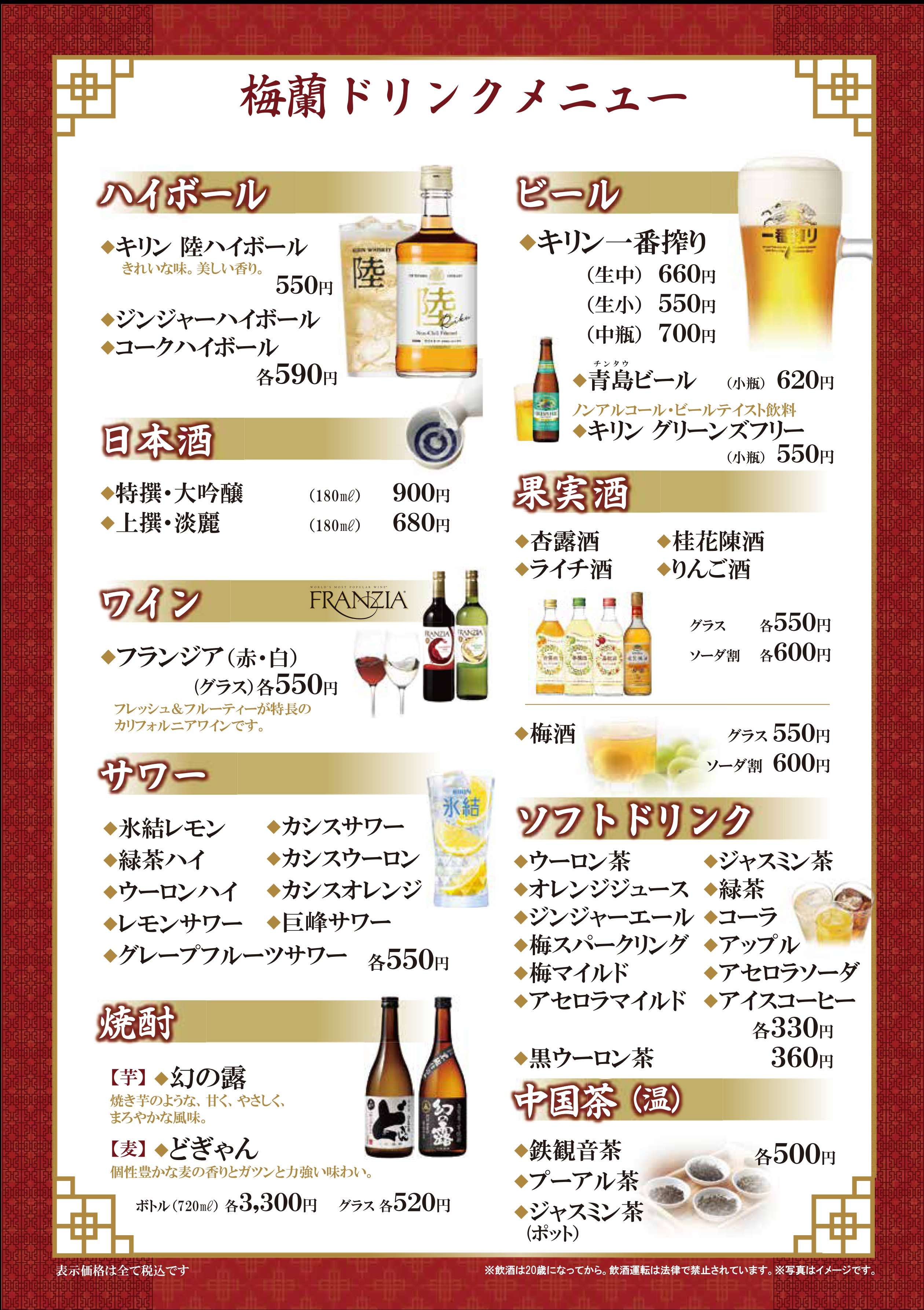 ★梅蘭横浜ベイクォーター店ドリンクメニュー★